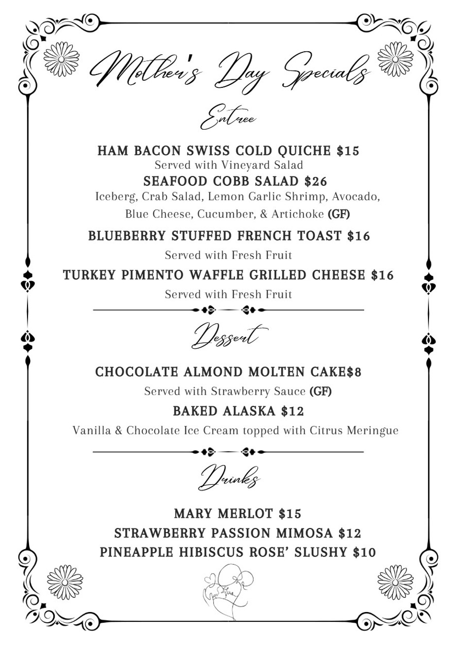 Join us on Mother's Day and treat your mom to a delicious meal! We have a special menu with food & drinks to spoil her! Friday May 8th-Sunday May 10th.