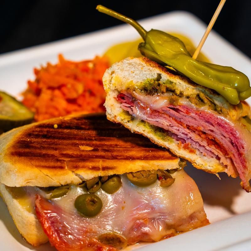 Ham, capicola, hard salami, mortadella, pepperoni & provolone layered with olive salad and pesto on a tasty sub roll. Served with house-made pickles, green tomatoes, & sweet potato carrot slaw | Pair with Merlot or Cranberry Pie Mead