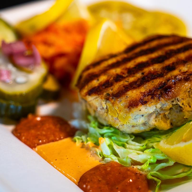Grilled lump crab cake served on greens with cocktail sauce, lemon, yum yum sauce, house-made pickled green tomatoes, & sweet potato carrot slaw. Double Crab Cake $30.00 (GF) | Pair with Unoaked Chardonnay or Blueberry Lavender Rose' Sangria