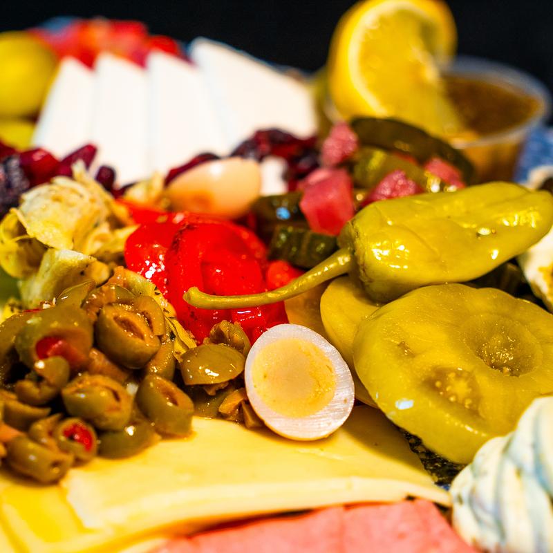 Prosciutto, ham, capicola, mortadella, salami, fontina, fresh mozzarella, sharp provolone, ricotta salata, antipasto salad, pickled & marinated vegetables, quail egg, fresh fruit, sunflower seeds, rosemary salt, green tomato jelly, hot pepper jelly, focaccia, & butter crackers. (GFA) | Pair with Sweet Rose' or Petit Verdot