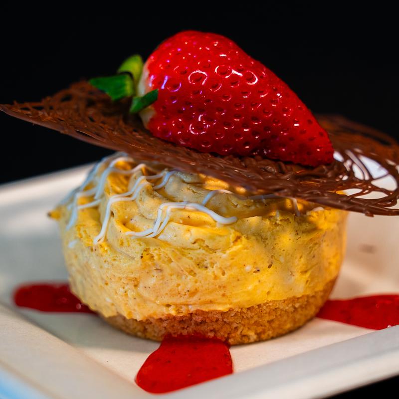 NY pumpkin pie cheesecake cupcake on graham cracker crust, glazed with milk chocolate. Served with strawberry sauce & whipped cream | Pair with Bubbly Blueberry or Blackberry Sangria