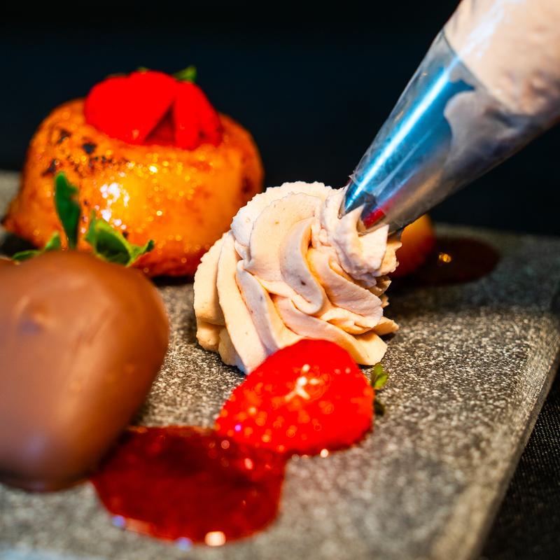Tiramisu, Spiced Caramel Crème Brulee', Chocolate Chip Cannoli, & Chocolate Strawberries served with whipped cream & strawberry sauce | Pair with Apple Cinnamon Sangria or Viognier