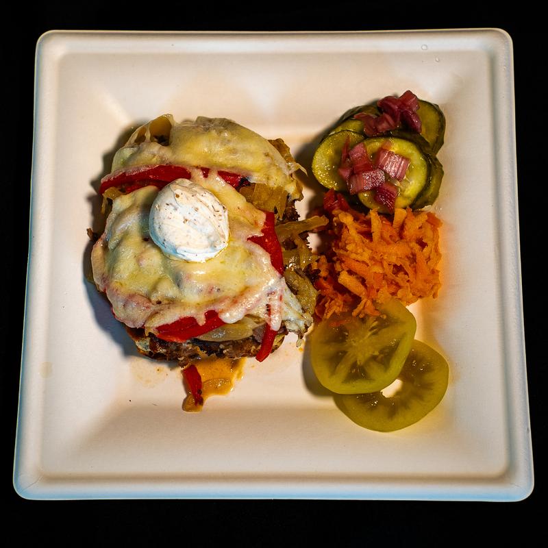 Slow-cooked pot roast on house-made focaccia topped with sautéed onions, sweet red peppers, fresh mozzarella & garlic herb mushroom butter. (GFA) Served with house-made pickles, green tomatoes & sweet potato carrot slaw | Pair with Reserve Cab Franc or LiL Tart Hard Cider