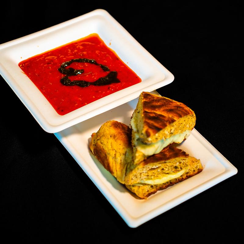 Warm house-made tomato soup (GF) topped with fresh pesto served with fontina focaccia grilled cheese | Pair with Viognier or Mariners Blend