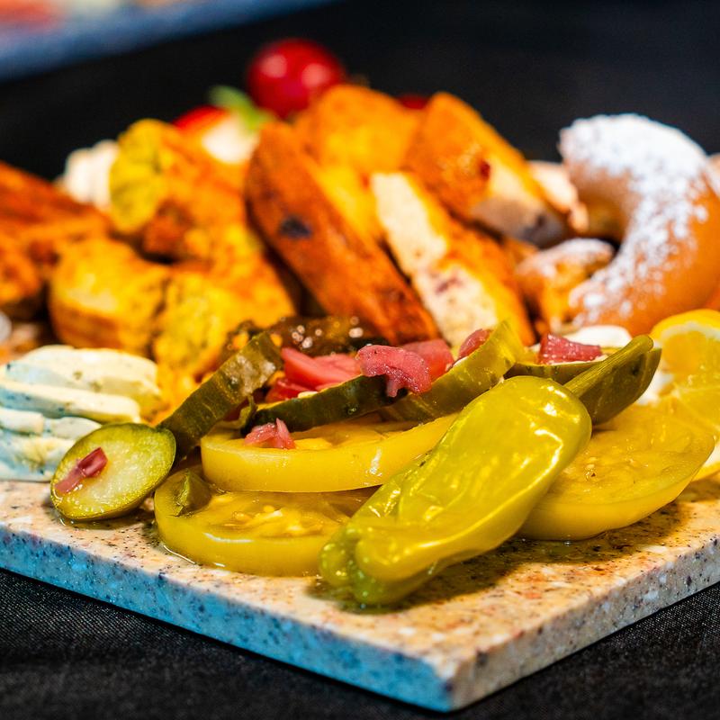 Fresh mozzarella, vineyard pesto, ricotta salata, alfredo spread, pumpkin spiced cheese ball, green tomato jelly & hot pepper jelly served with fruit, sunflower seeds, rosemary salt, cornbread & spiced cranberry donut, spiced butter, focaccia, & crackers | Pair with Viognier or Pineapple Sangria