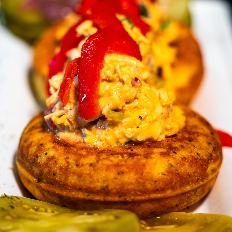 Pimento pepper cream cheese spread on house-made cornbread donuts served with sweet red peppers, pickles, pickled green tomatoes & jalapeno | Pair with Merlot or Cranberry Lime Sangria